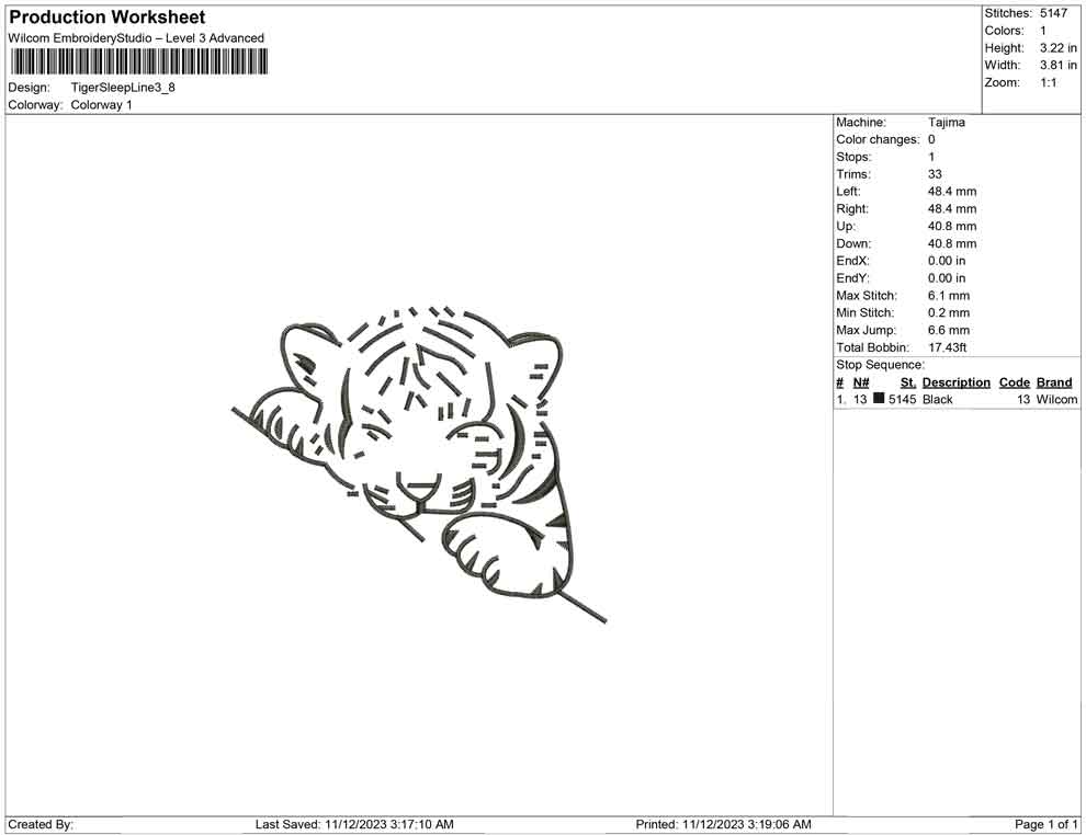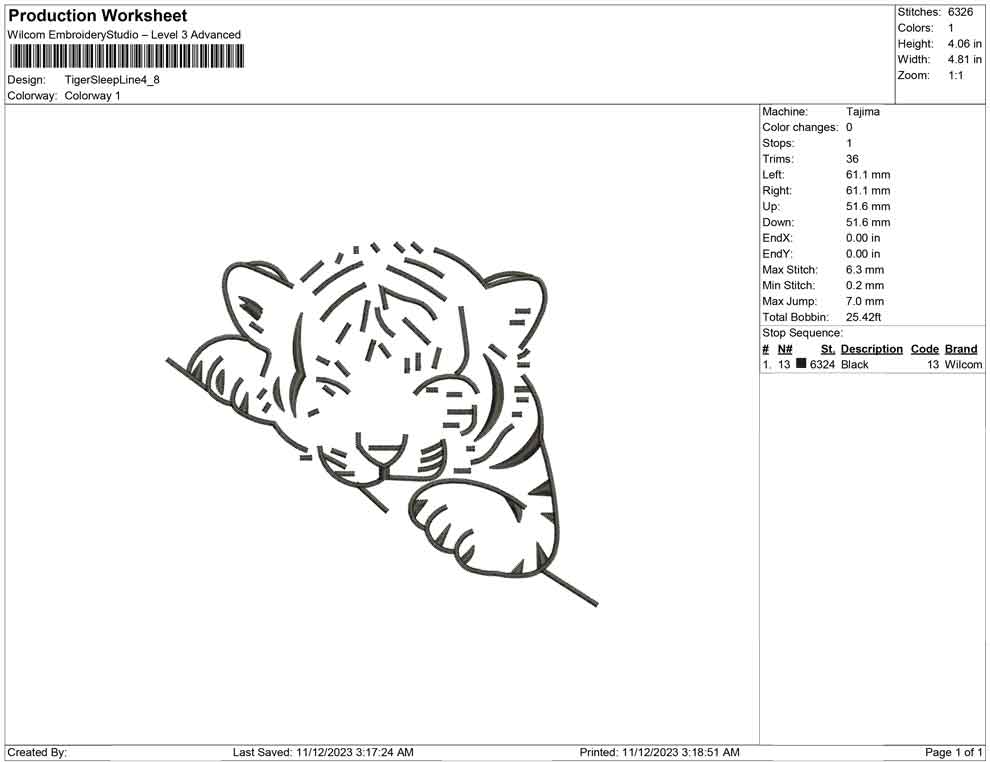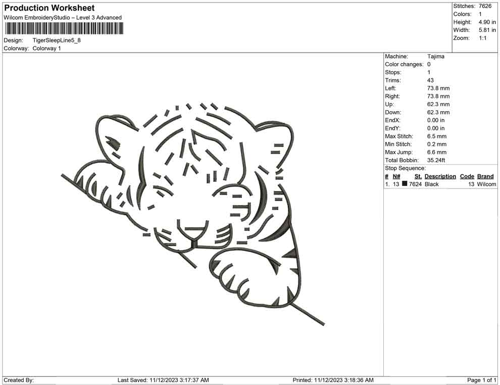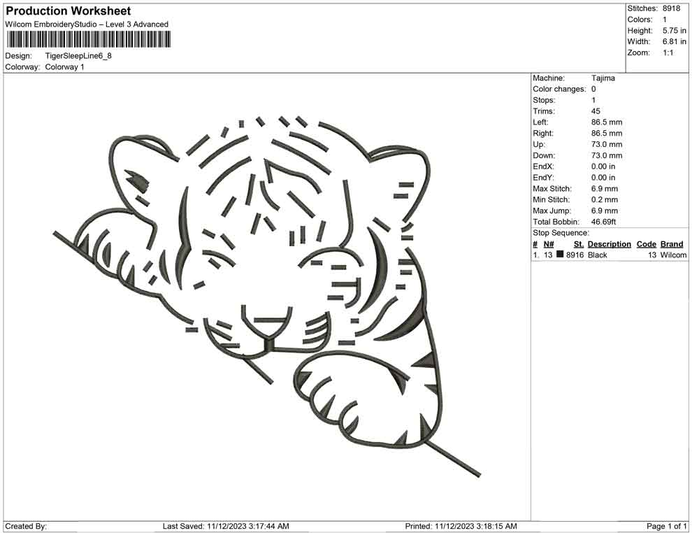 Tiger Sleep Liine embroidery design