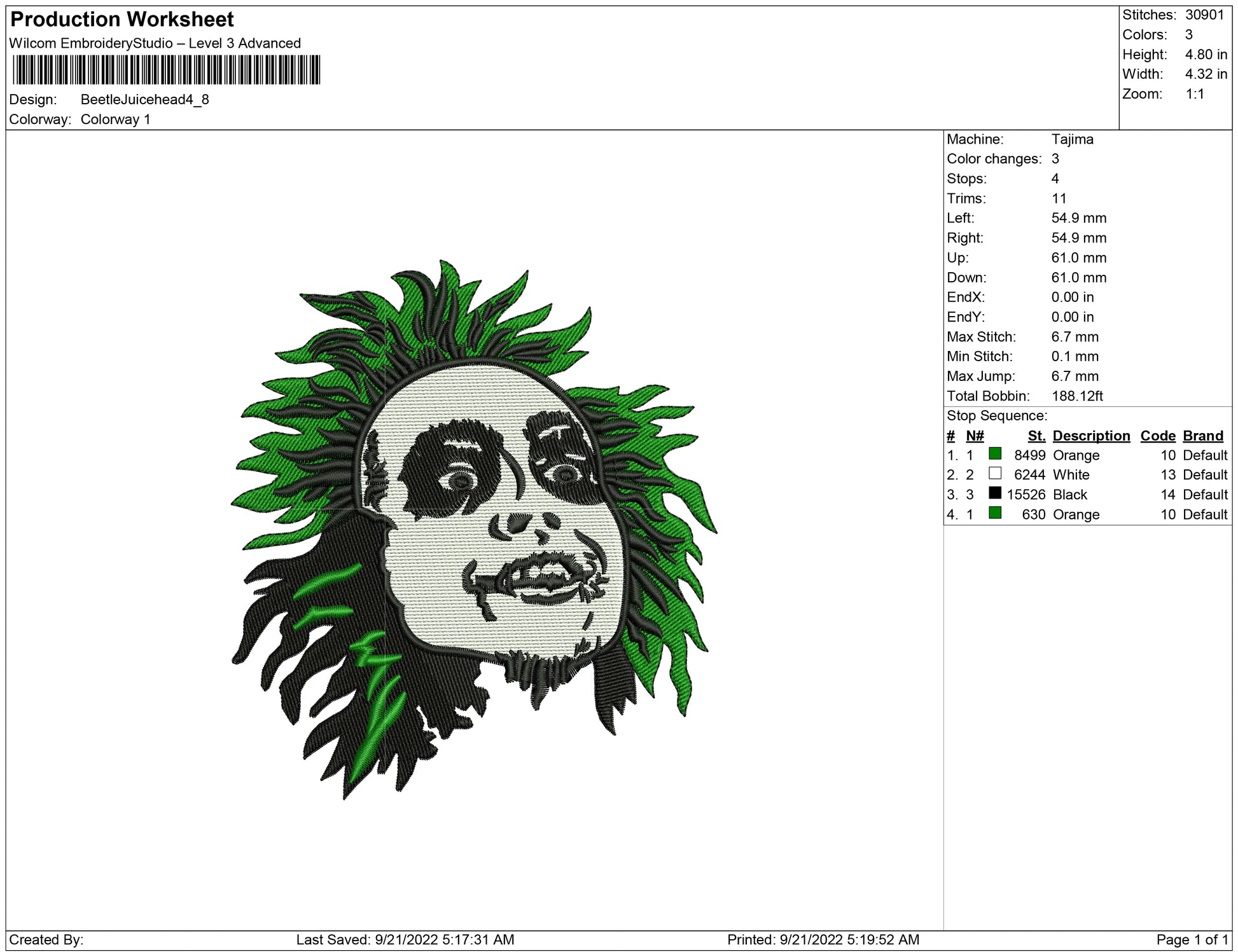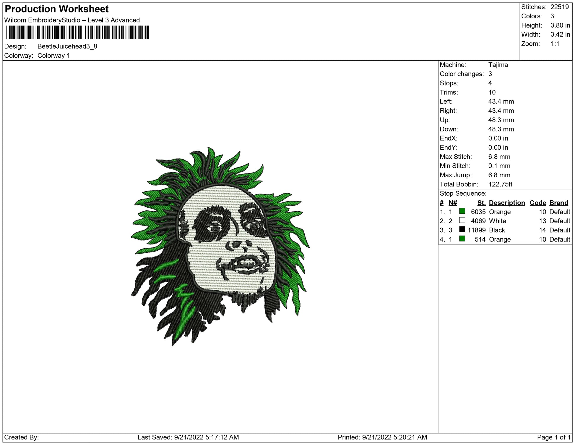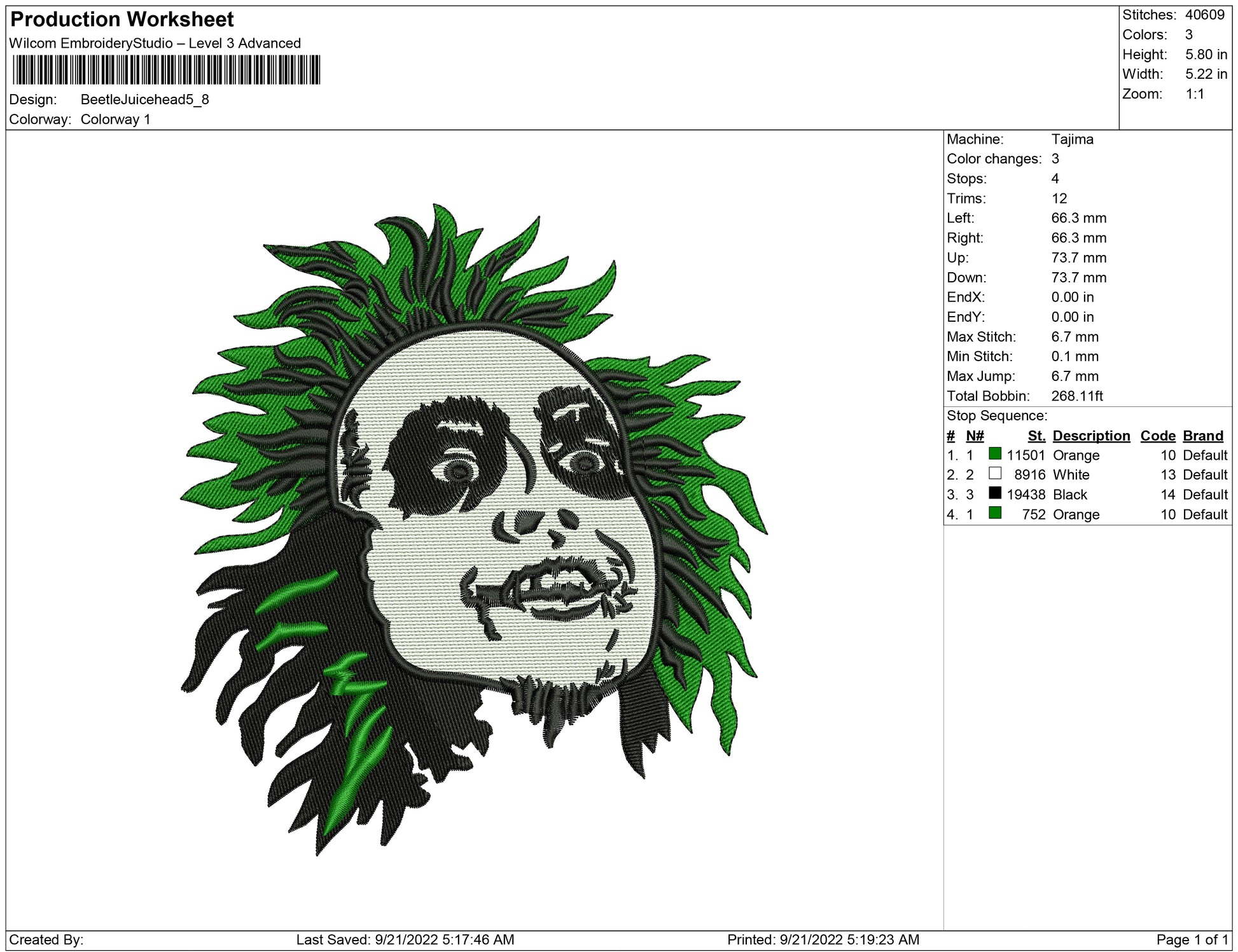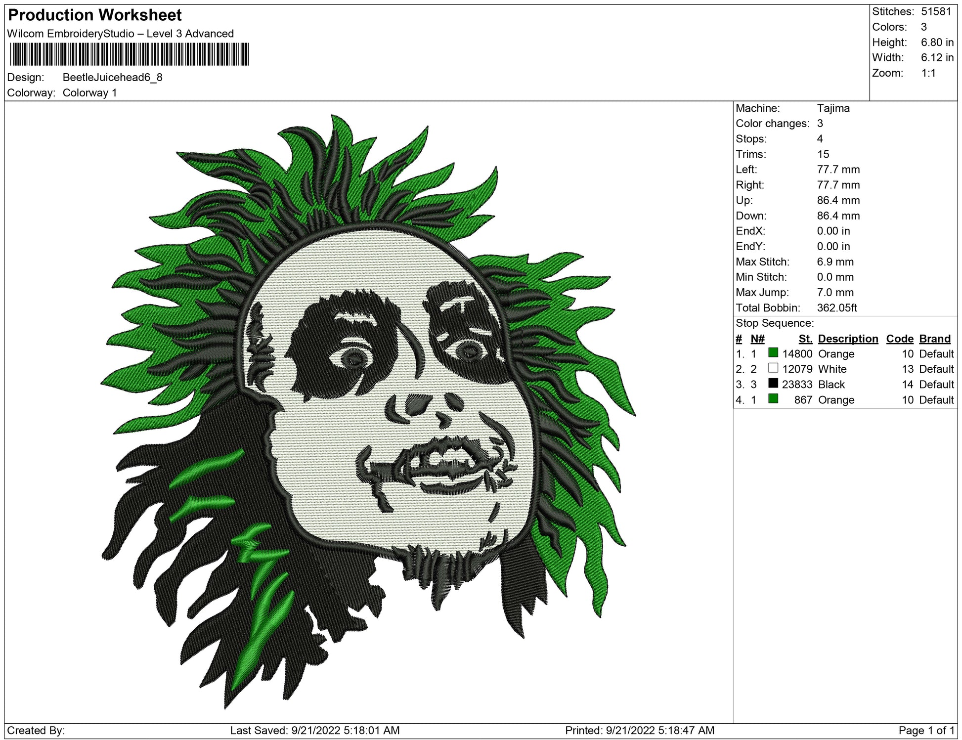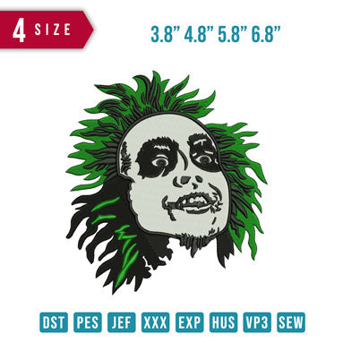 Beetle juice head embroidery design