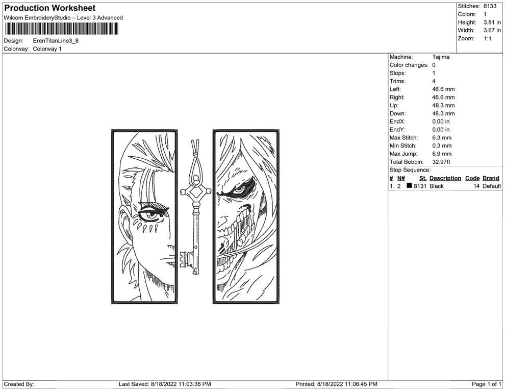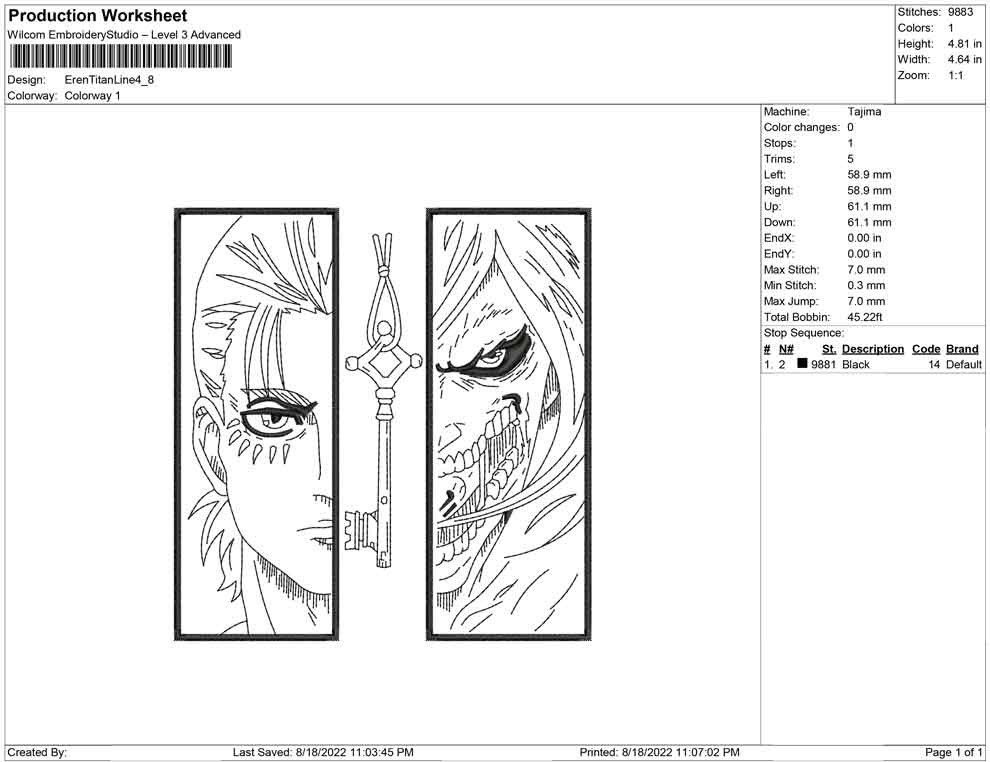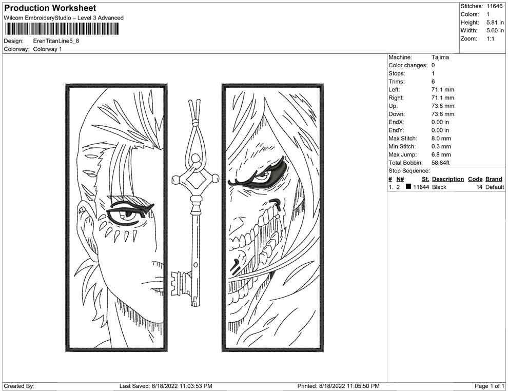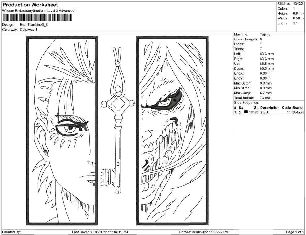 Eren Yeager Titan Line art embroidery design