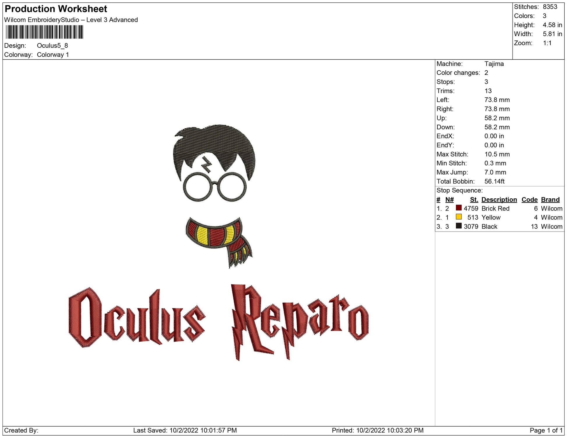 Oculus Reparo embroidery design