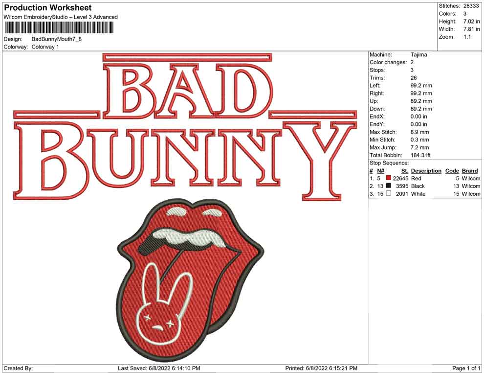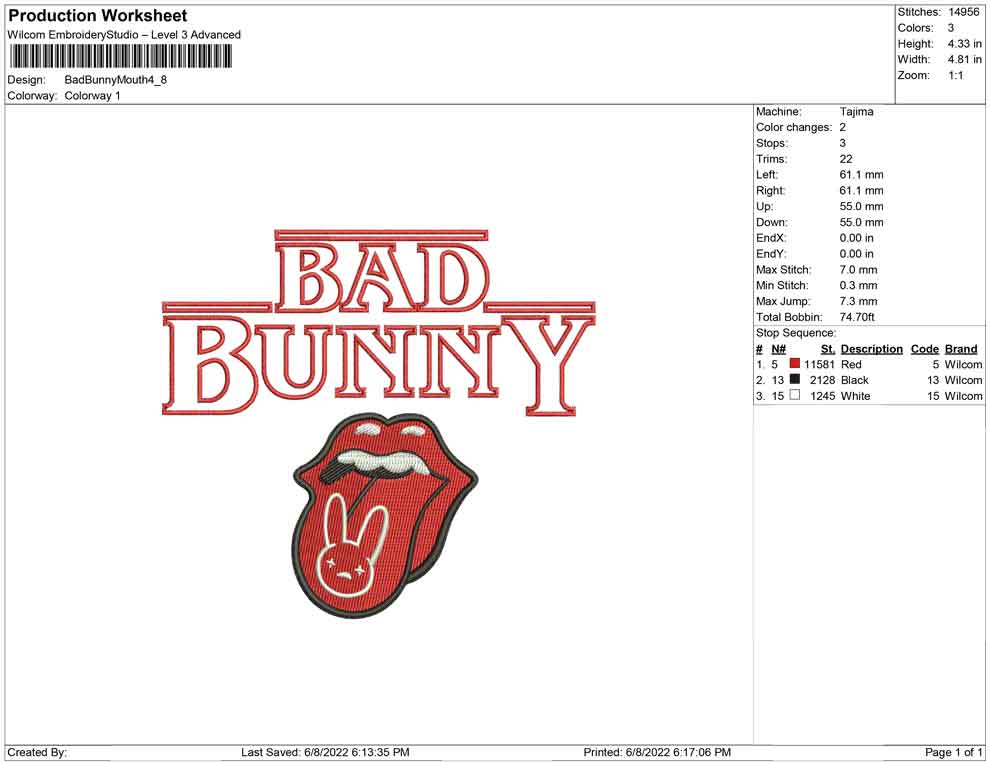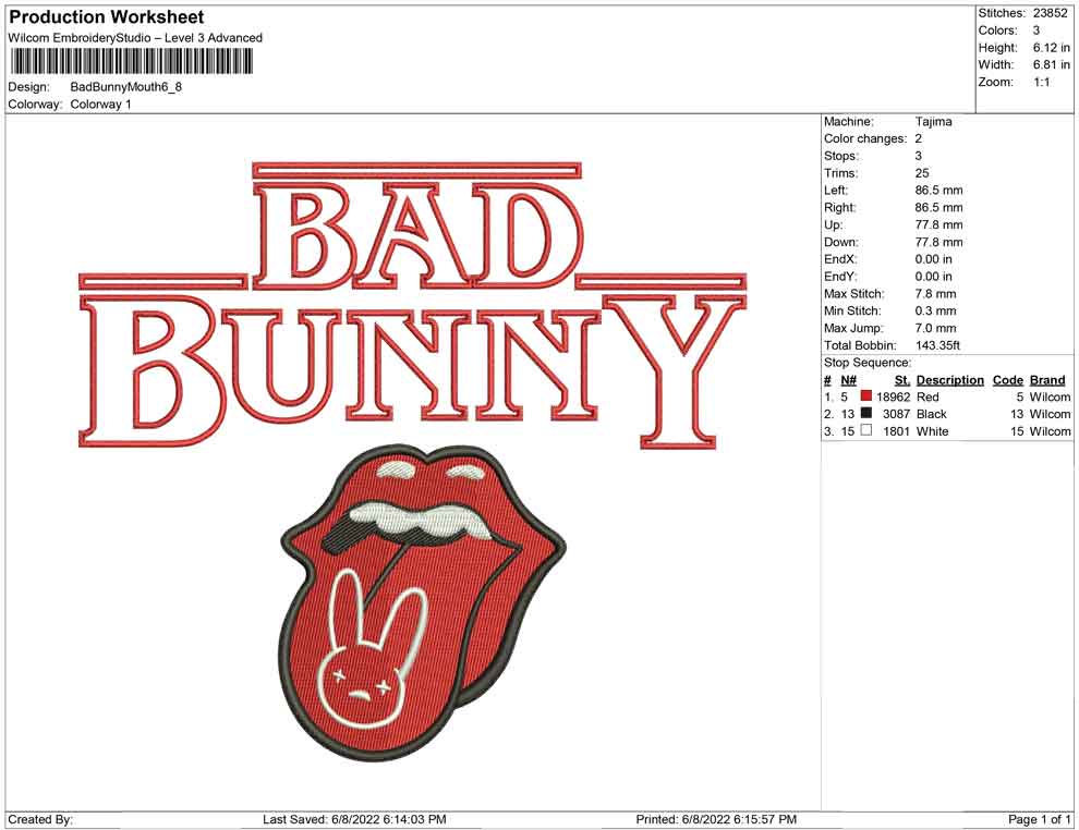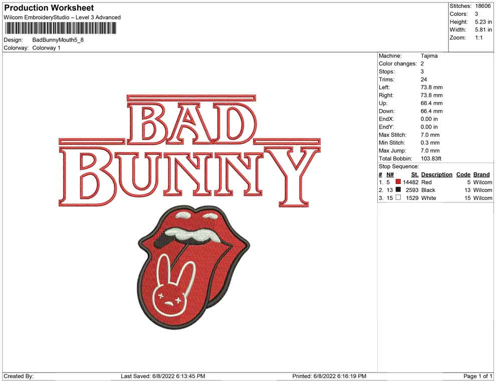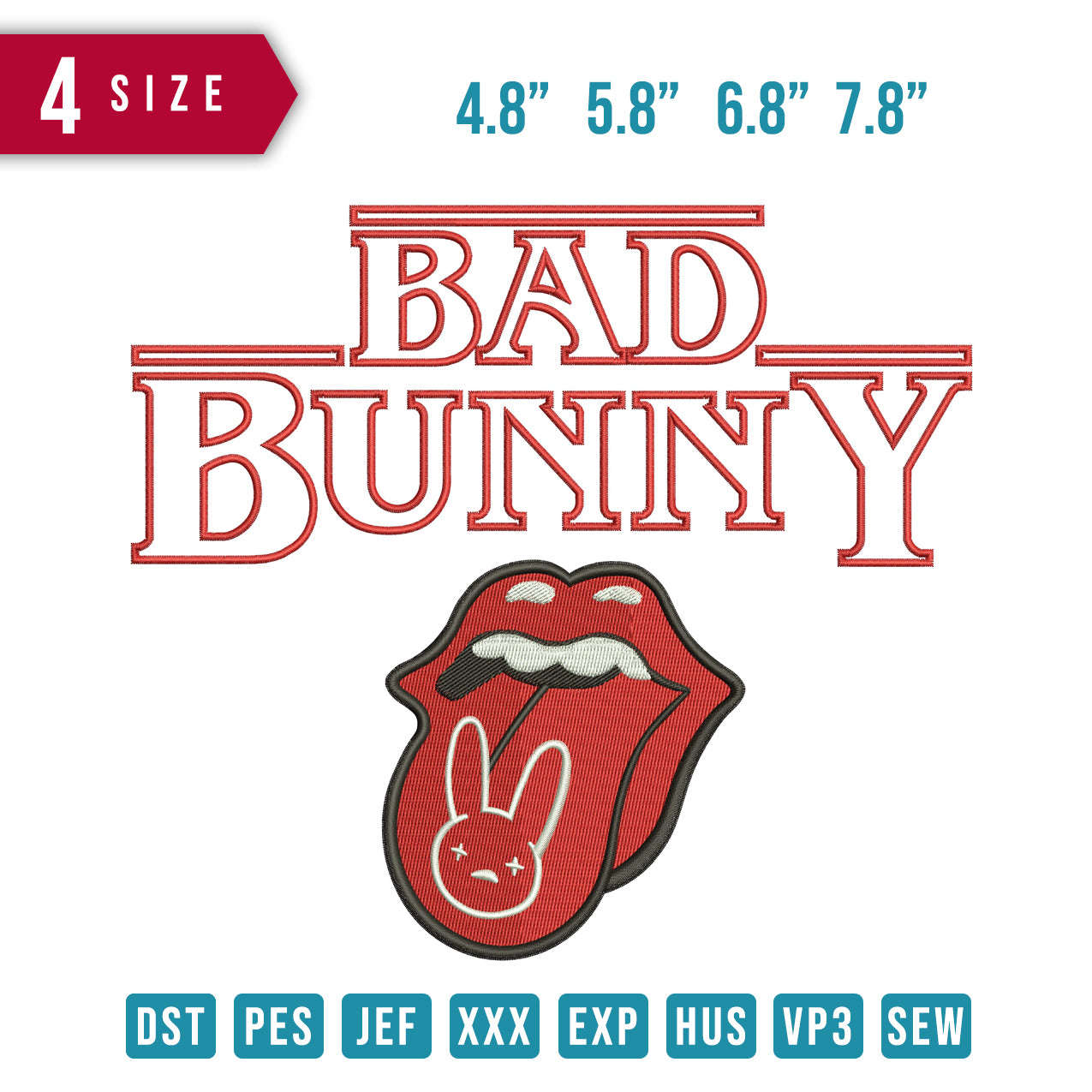 Bad Bunny Mouth rolling stone embroidery design
