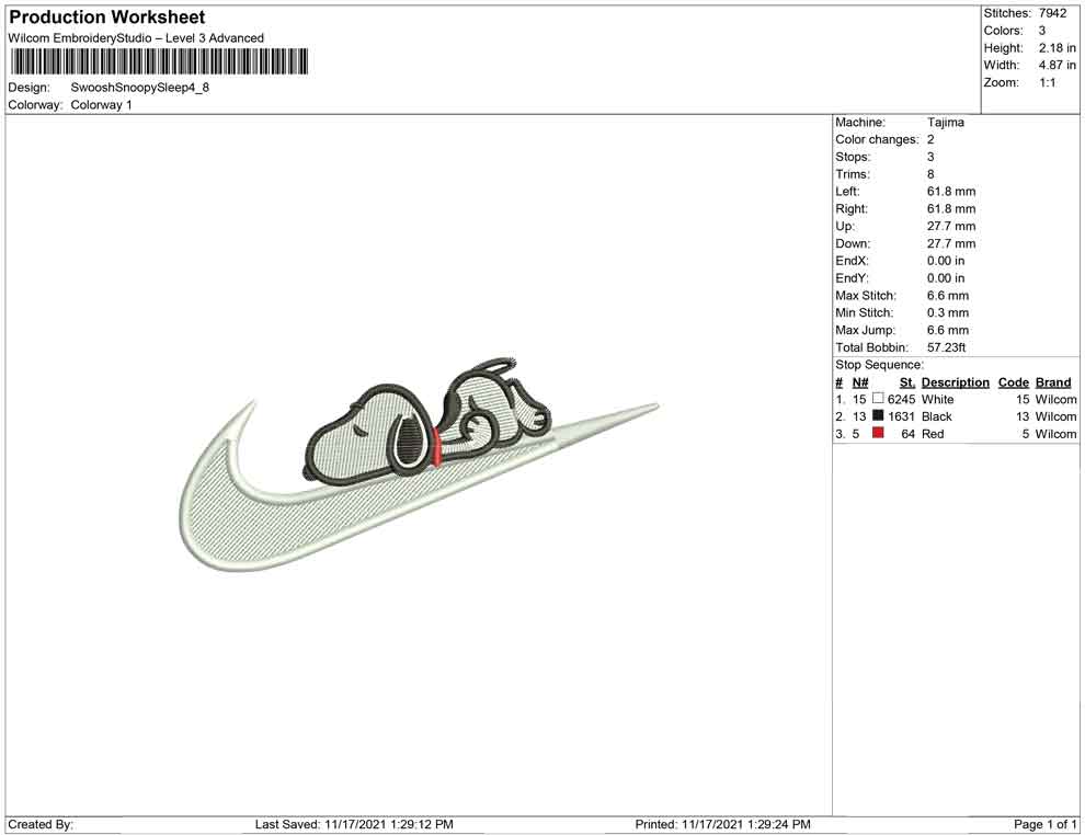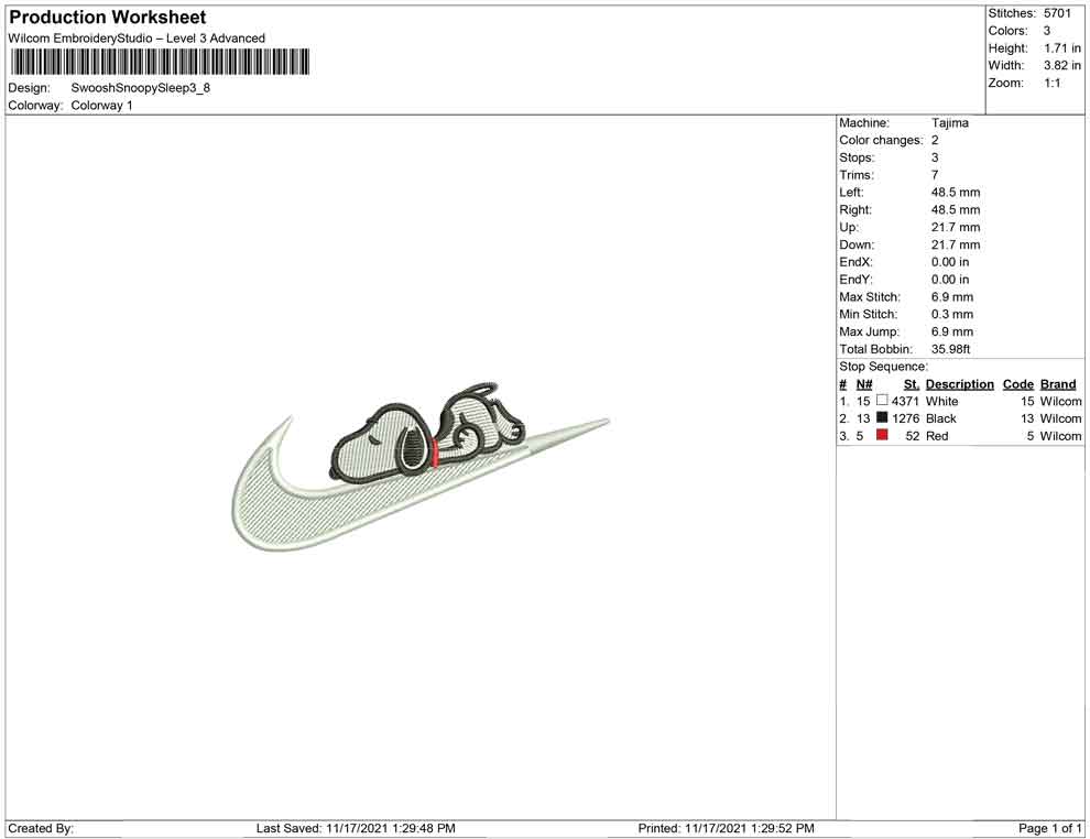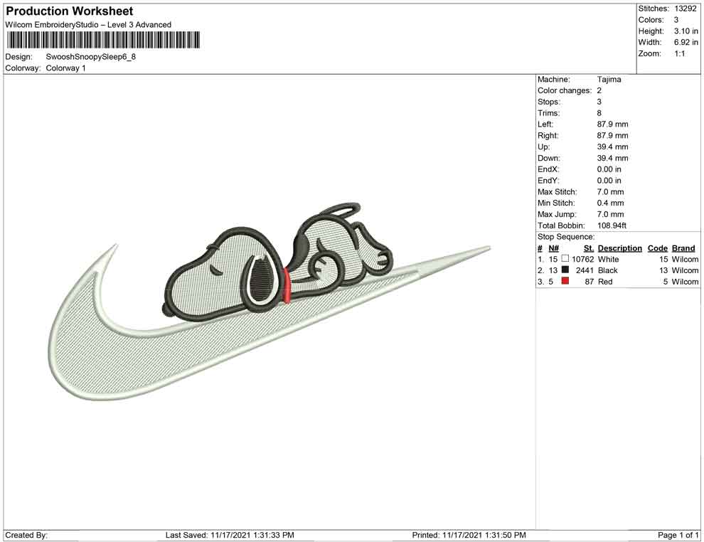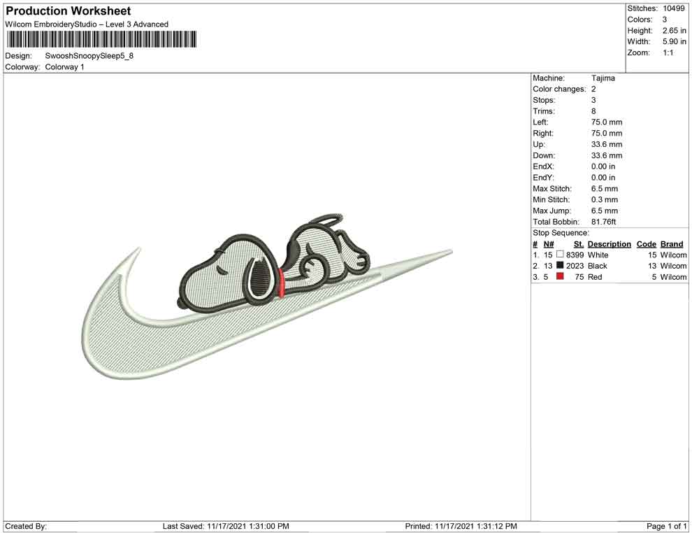 Swoosh Snoopy Sleep embroidery design